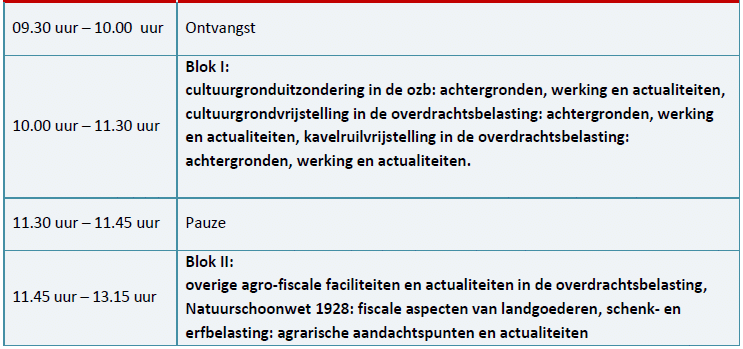 In deze cursus worden diverse thema’s op het terrein van het agro-fiscale recht behandeld. De voor de fiscaal adviseur in de agro-praktijk belangrijkste uitgangspunten en actualiteiten op het terrein van onder meer de schenk- en erfbelasting, de onroerende zaakbelasting, de overdrachtsbelasting en de Natuurschoonwet 1928 passeren de revue en worden besproken. Daarbij is steeds aandacht voor de praktische toepassing, de aandachtspunten en valkuilen voor de praktijk en de rol van de fiscaal adviseur(s) in dit verband. Met praktische voorbeelden wordt de theorie verduidelijkt. Ook is er ruime gelegenheid tot het stellen van (praktijk)vragen.