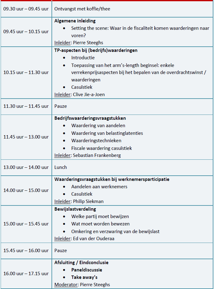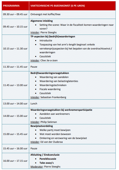 Tijdens deze sessie behandelen we onderwerpen zoals transfer pricing aspecten bij waarderingen in het kader van een bedrijfsherstructurering, bedrijfswaarderingen en werknemersparticipatie, en bekijken we diverse praktische casestudies en jurisprudentielijnen die direct toepasbaar zijn in jouw adviespraktijk, aangifte en bezwaar/beroep.