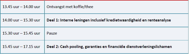 Tijdens de cursus zullen verschillende soorten financiële transacties behandeld worden waarbij er eerst stilgestaan zal worden bij de verrekenprijsanalyses van interne leningen en de daarbij behorende renteanalyse inclusief de rol van kredietwaardigheid (rekening houdend met impliciete ondersteuning) en de ‘debt capacity’ van de inlener. Dit vormt vervolgens de basis voor een verdere verdieping waarbij cash pools, garanties en financiële dienstverleningslichamen zullen worden behandeld. Er zal naast de theorie van deze deelonderwerpen ook aandacht zijn voor de praktische toepassing aan de hand van praktijkvoorbeelden.