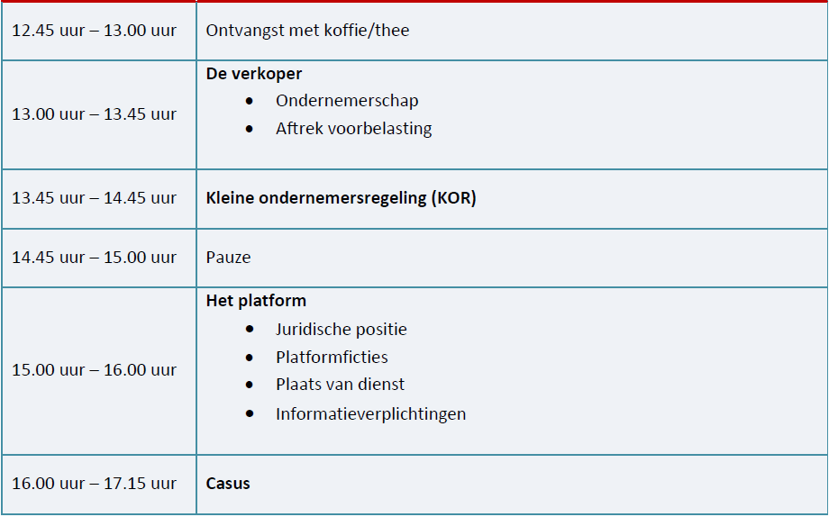 Tijdens deze cursus wordt de positie van de kleine ondernemer belicht, waarbij uitgebreid ingegaan wordt op het ondernemerschap, de aftrek van voorbelasting en de KOR. Platforms spelen ook een belangrijke rol in de groei van het aantal particulieren dat actief is geworden op de markt. In het tweede deel van deze bijeenkomst wordt daarom ingegaan op de btw-positie van deze platforms. Dat is niet alleen voor deze platforms zelf van belang, maar ook voor de personen die actief zijn op deze platforms. Omgekeerd is voor platforms van belang om te weten wat de btw-positie is van de verkopers. Naast eventuele btw-verplichtingen ter zake van de verkopen op platforms zijn platforms ook verplicht om bepaalde informatie aan de belastingdienst te verstrekken. Hieraan zal ook aandacht worden besteed tijdens de cursus. De cursus is daarmee interessant voor zowel adviseurs die particulieren bijstaan die actief zijn op de markt als adviseurs die platforms bijstaan. De cursus wordt afgesloten met een praktijkcasus, waardoor je niet alleen op de hoogte bent van de van toepassing zijnde regelgeving, maar ook hebt geleerd hoe deze problematiek in de praktijk naar voren komt.