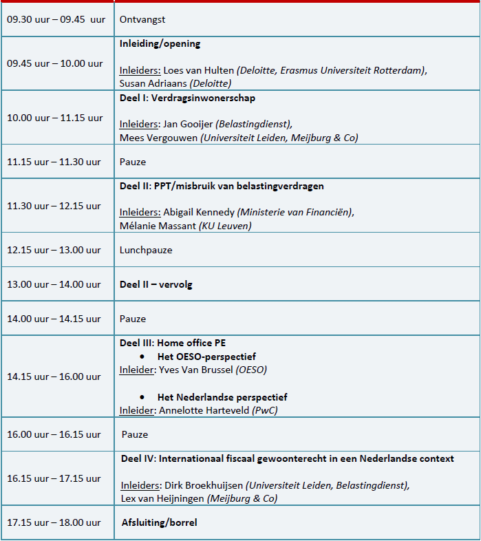 De rol en relevantie van het internationale belastingrecht is de afgelopen jaren sterk toegenomen. Onder andere nieuwe internationale standaarden, digitalisering en een veranderende economische realiteit zorgen voor een nieuwe dimensie in de fiscale (advies)praktijk. Tijdens de Rondetafelbijeenkomst Internationaal Belastingrecht nemen deskundige inleiders vanuit verschillende fiscale perspectieven (van de OESO tot de belastingadviespraktijk en van de Belastingdienst en het Ministerie van Financiën tot het academische fiscale speelveld) de deelnemers mee langs de belangrijkste ontwikkelingen en discussiepunten rond vier actuele internationaal belastingrecht thema’s: verdragsinwonerschap, de Principal Purpose Test (PPT), de thuiswerk vaste inrichting en de rol van internationaal fiscaal gewoonterecht in een Nederlandse context. Voor meer informatie over de onderwerpen en de inleiders zie het programma hieronder.